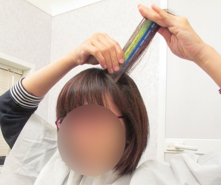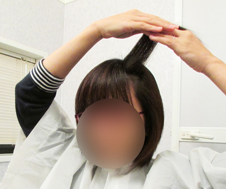 まず、指で挟める量の髪の毛を適当に取り分け、頭皮に対して直角に引っ張り伸ばします。