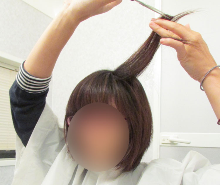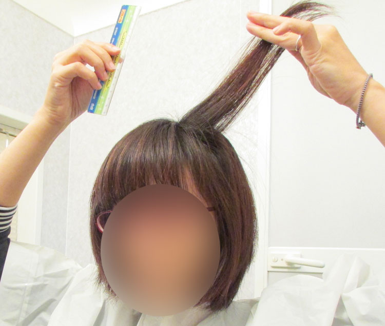 ボブにする場合は挟んだ指の上(↑写真と同じ位置)、ショートにしたい場合は挟んだ指の下を切ると良いです。長さはお好みで調整してください。
