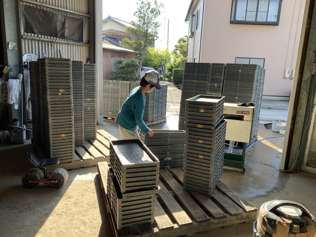 お手伝いの内容は主に機械に補充する苗箱を運ぶ作業。